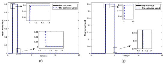 In view of the harsh environment on wet roads, the input curves of front and rear wheel angles are shown in Figure 4a. Figure 4b,c shows the curves of the yaw rate and side slip angle of the vehicle. The state estimation error curves are given in Figure 4d,e. The actuator faults estimations are shown in Figure 4f,g.
