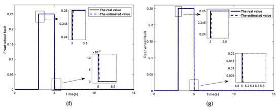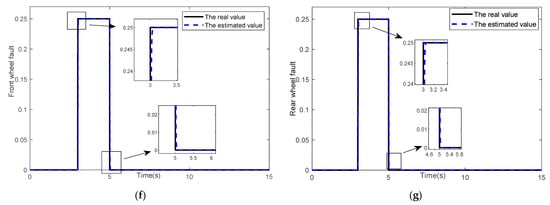 The variation trend of the front wheel angle is basically consistent with the driving path, and there is no large deviation. The absolute value of the side slip angle of the four-wheel steering vehicle can be maintained around 6 deg/s. In the case of sudden actuator fault at 1 s and 3 s, there are obvious errors between the estimated the yaw rate and side slip angle and the real value, but the estimated value can quickly track the real value. It can be seen from Figure 2d,e that the yaw rate error is within 0.006 deg/s, and the side slip angle error is within 0.002 deg, respectively. The estimation of the yaw rate and the side slip error are within the acceptable error range, which indicates that the designed observer has strong robustness. Figure 2f,g shows the estimated and real fault curves of the front and rear wheel of the vehicle, respectively, to realize the reconstruction of actuator faults and achieve the purpose of fault diagnosis. In addition, it can be seen from the figure that the designed method can diagnose faults in real time when faults occur. As can be seen from the Figure 2, the vehicle can respond in real time, and the yaw rate is controlled to prevent vehicle instability.