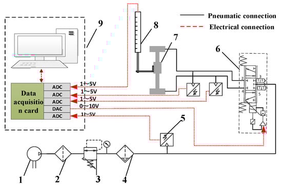 Schematic of the servo control system for the position of the magnetically even rodless cylinder (1—air compressor; 2—air filter; 3—air regulator; 4—air lubricator; 5—pressure transmitter; 6—proportional directional control valve; 7—magnetically coupled rodless cylinder; 8— pull-rod displacement sensor; 9—IPC).