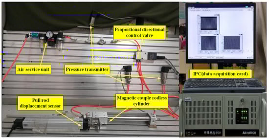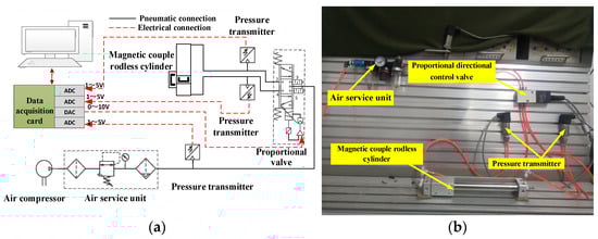 Figure 1 represents the experimental principle of the magnetically coupled rodless cylinder position servo system. The solid line represents the pneumatic connection, and the dashed line indicates the circuit connection. The compressed air produced by the compressor can be filtered, decompressed and dried through the pneumatic triplet (air filter, regulator and lubricator), providing a stable pressure to the system. The system selects a three-position five-way proportional directional control valve as the pneumatic control element of the system by use of a tie-rod displacement sensor to measure the displacement of the magnetically coupled rodless cylinder and a pressure transmitter to measure the supply pressure and the pressure of the two chambers of the cylinder. The tie-rod displacement sensor and pressure transmitter can produce a 1–5 V analog voltage signal. The data acquisition card is collected after the data acquisition. It can also convert the digital signal into an analog voltage signal. Through the collection and processing of the signal, the flow and flow direction of the gas at the two valve ports can be changed to accurately control the movement of the magnetically coupled rodless cylinder.