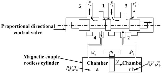 The gas flow principle of the valve control cylinder system is shown in Figure 3. Ports 2 and 4 of the proportional directional control valve are connected to the two ends of the magnetically coupled rodless cylinder, assuming that the left and right chambers of the cylinder are Chambers A and B. The left-and-right movement of the spool of the proportional directional control valve changes the flow direction of the gas and realizes the left-and-right round-trip movement of the piston in the cylinder. , in the figure show the mass flow of the control valve flowing through the proportional direction to the two chamber gases of the cylinder. , represent the pressure of the two chambers of the cylinder. , show the volume of the two chambers of the cylinder. , indicate the temperature of the two chambers in the cylinder. m represents the mass of the load, and indicates the displacement of the piston in the cylinder. In addition, , indicate atmospheric pressure and supply pressure, respectively.