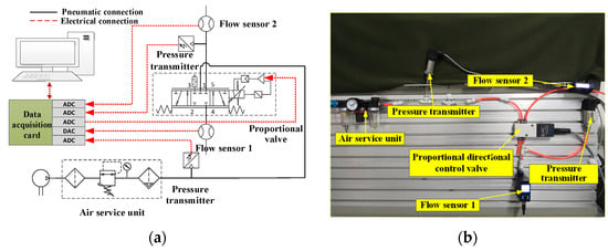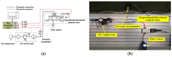 Tests of the pneumatic circuit of the flow coefficient of the proportional valve: (a) schematic; (b) experimental test platform.