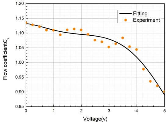 Test principle of the flow coefficient: With the change in the control voltage, the effective opening area of the valve port will also change. Since the flow capacity is related to the change of the flow coefficient, it is necessary to measure the mass flow of the valve port at different voltages and then calculate the different flow coefficients. The calculated value of the quantity coefficient can be brought into MATLAB’s fitting toolbox, and the mathematical relationship between the flow coefficient and the control voltage can be polynomially fitted [21]. According to Equations (1), (5) and (6), the value of the flow coefficient can be calculated by: