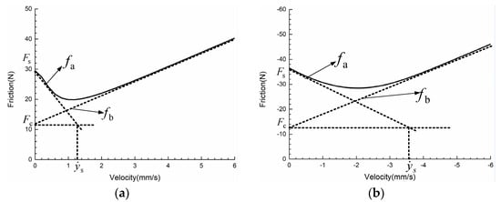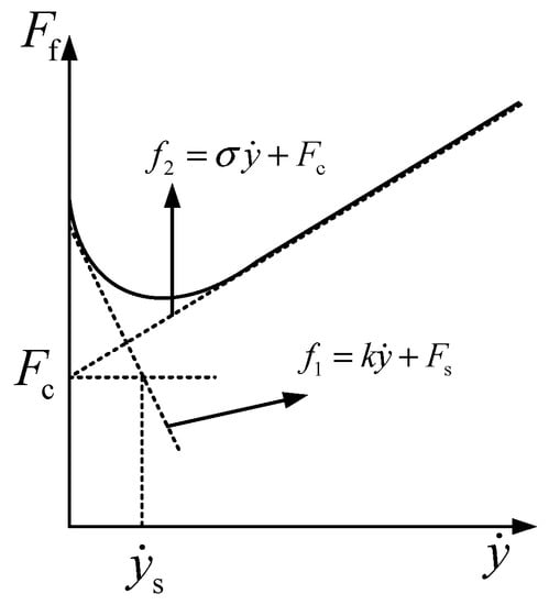The Stribeck friction model is also known as an exponential model [23]. In 1902, Stribeck found that the change in friction of an object moving at low speed shows a negative damping characteristic; that is, the friction will decrease with the increasing speed of the object. This is mainly because when an object is moving at low speed, the effective contact surface of the object is not in a state of sufficient lubrication. As the speed of the object gradually increases, the degree of lubrication of the object will also gradually increase. Therefore, the friction force will decrease. When the object is moving rapidly, the contact surface of the object is in a complete lubrication state, and the viscosity friction plays a dominant role and increases with the increasing speed. As shown in Figure 12, the relationship between friction and operating speed is described. Its friction model is as follows: