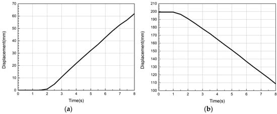 As shown in Figure 11, with the increase in the valve control voltage, the flow coefficient will gradually become smaller, indicating that the flow capacity of the gas through the valve port is getting smaller and smaller, and the control voltage range of the proportional directional control valve is 0–10 V. When , the valve core moves to the left. When , the spool moves to the right. The relationship between the control voltage and the valve spool displacement is shown in the following equation: