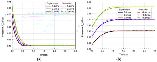 The experimental platform for fixing the chamber inflation and deflation is shown in Figure 17. The experimental process is as follows: the supply pressure is set to 0.4 MPa. First the spool of the proportional directional control valve is adjusted to the end of the valve body, and then the control voltage is adjusted to 5.08 V. When the pressure of the two chambers of the cylinder is stabilized, the control voltage is adjusted to 4.4 V. At this time, Chamber A will be deflated, Chamber B will be inflated, and both will then slowly reach a stable state. The piston of the cylinder remains stationary throughout the experimental process [24]. In order to avoid the accident of the experiment, adjust the air supply pressures to 0.5 MPa and 0.6 MPa respectively, and repeat the above experimental process.