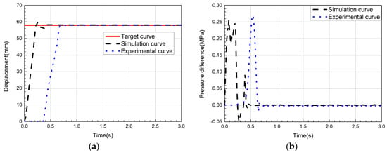 According to the pneumatic circuit shown in Figure 1, the nonlinear model is verified by PID-controlled positioning experiments. The air supply pressure is constant at 0.52 MPa, and given a step signal, the target position is 58. The results of the experiment and simulation are shown in Figure 19, because the cylinder inflation requires a certain reaction time during the experiment, and the simulation is carried out under ideal conditions, so the experimental reaction time will be slower than the simulation. However, the experiment is consistent with the trend of the simulation curve.