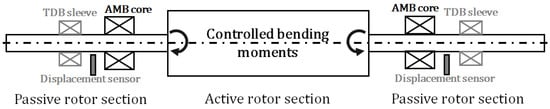 A schematic of the general rotor topology is shown in Figure 1. It consists of a central hollow rotor section, that hosts actuators capable of creating a controlled internal bending moment. Acting symmetrically along the middle radial plane of the rotor, the bending moment is applied at the couplings between the hollow active section and the passive support shafts of a smaller diameter. Laminated cores for the AMB and landing sleeves for the Touch-Down Bearings (TDBs) are assembled on the smaller passive shaft sections. The displacement measurement necessary to ensure stable levitation with the AMBs is taken via displacement sensors located between the AMBs and TDBs sleeves on both sides. The bending moments generated aim to reduce the rotor run-out and ensure clearances are within a given tolerance, without utilising the AMB system. It does so by adding a low energy, low frequency counter-bend to the rotor. The control algorithm is iterative and feed-forward with very low sampling frequency, designed to ensure stability and minimise the size and complexity of the on-board control system. This paper focuses on the feasibility and effectiveness of such a concept from a theoretical perspective, paving for way to an experimental prototype for validation. First, the model used to design the prototype is described, as well as the active control strategy. The resulting mode shapes and location are presented together with the results and a prototype render.