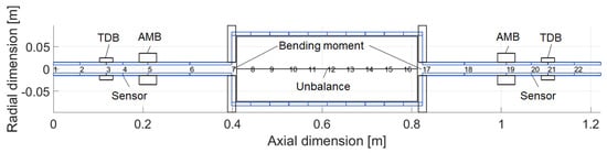 with the number of elements in which the rotor is decomposed. The shaft elements are modelled using Timoshenko beam theory, and participate both in the strain and the kinetic energies. The disks are considered rigid and will thus only participate to the kinetic energy. These disks are used to represent the sleeves for the TDBs and the AMBs, as well as the actuator system inside the rotor. Using the beam displacement functions ([34] (pp. 51–52)) and Equation (1), application of the Lagrange equations yields