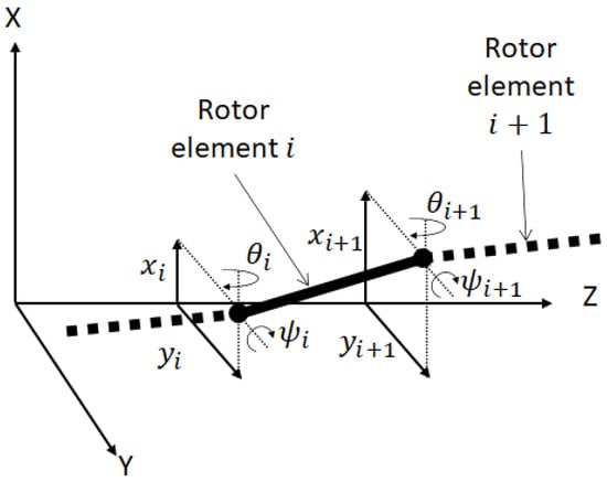 where is the rotation speed of the rotor, is the vector of nodal external forces on each node and , , and are the generalised mass, gyroscopic, and stiffness matrices, respectively. The generalised matrices are a composition of the 8 by 8 mass, gyroscopic, and stiffness elemental matrices , , and in such a way that the four degrees of freedom of each adjacent nodes are coupled. The elemental matrices are defined in [34] and represent the link between the four degrees of freedom of two adjacent nodes.