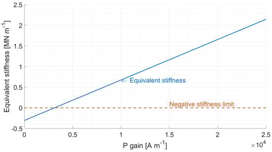 Relationship between AMBs stiffness and PID proportional gain, showing that a minimum P of 3000 A gain is necessary to overcome the negative stiffness.