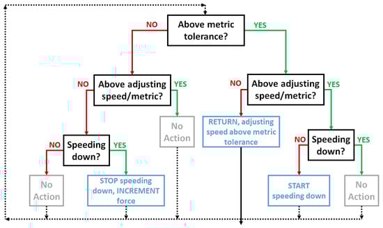 The active rotor section has an actuator with built in control that allows for quick iterations, such that the resonance vibration peak can be overcome using the smallest possible force. Three main parameters are used in the adaptive control, which are the metric (i.e. displacement at sensors, coil control current, etc.), the tolerance for the metric, which when exceeded will trigger the rotor to slow down and an increase in the control moment, and finally the speed at which the bending moment is adjusted. Figure 5 summarises the adaptive algorithm logic used to adjust the control force. The concept of reducing the speed before proceeding to the adjustment arises from practical considerations, where it is safer to operate the rotor away from the resonance frequency when the adjustment is made, otherwise any small variation around the resonance could be amplified greatly. There is an optimum set of parameters where the correct control force is reached quickly and the rotor speed is not reduced more than necessary, which is a compromise to be found during a future experimental phase.