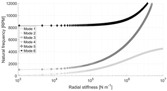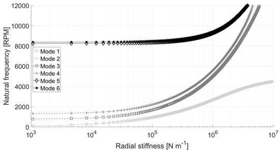 Since the AMBs enable fine tuning of the support stiffness, the influence of the radial stiffness on the eigenvalues is examined. Figure 6 shows the evolution of the first 6 modal eigenvalues versus the AMB equivalent radial stiffness without gyroscopic effects. Two plateaux are visible, representing the free-free and clamped-clamped conditions, with a transition between and N m. Figure 7 shows the case where the gyroscopic effects are included with the rotor rotating at 10,000 RPM. A slight mode splitting between the forward and backward whirl is visible. These results show that the stiffness of N m is located in the transition zone, which allows to adjust the resonance frequencies easily by varying the proportional gain of the controller.