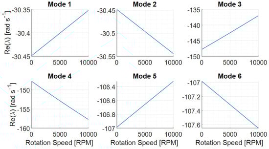 When it comes to the stability of these modes, Figure 8 shows the real parts of the eigenvalues associated with each mode versus the rotating speed, all of them being negative, hence stable.