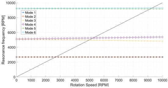 Figure 9 shows the Campbell diagram, with the natural frequency evolution versus rotating speed. The relatively low mode splitting due to gyroscopic effects is evident. Six intersections between the rotor speed and natural frequencies over the operating range can be noted. The modes for which the natural frequencies decrease with rotating speed are backward whirls, whereas those increasing are forward whirls. Only the latter should be excited by the unbalance. This leaves three resonance frequencies that will be encountered while speeding up, at 2700 RPM, 5300 RPM and 9300 RPM.