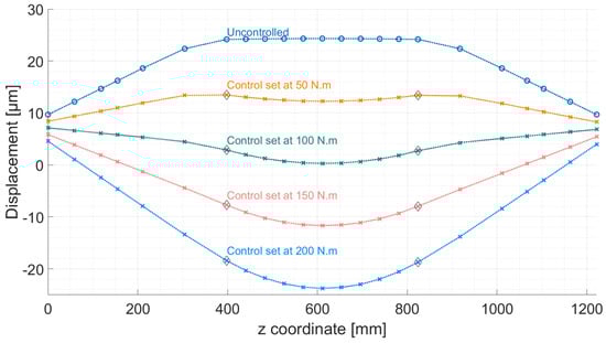 The uncontrolled deflected shape corresponds with the larger second moment of area of the middle section, almost undeformed compared to the smaller diameter support shafts. The relatively low stiffness of the AMBs is also displayed by the fact that the AMBs nodes are not fixed at zero displacement but are closer to a free-free condition rather than a clamped-clamped condition. Increasing the bending control moment shows that the rotor cannot be straightened perfectly as the two moments cannot counteract the unbalance force. It is, however, possible to optimise the moment in several ways, depending on the rotor application. For example, the average radial displacement of every node the rotor could be minimised, or else the distance of each radial displacement to the average radial displacement, thus ensuring that the rotor is as straight as possible. Another example is if an attachment such as a disk with blades is located at a specific point along the shaft, it is possible to minimise the radial displacement for this particular point in order to maintain the clearance between the blades and the stator, which is a critical parameter for efficiency. The case of the rotor mid-point radial displacement being minimised is used to examine the adaptive algorithm, where the rotor is spun up to 10,000 RPM with the unbalance of 180 g mm. The adjusting speed, where the force will be iteratively increased if the tolerance is exceeded, is set at 2000 RPM while the vibration limit not to be exceeded is set to 15 . The speed increment or decrement at each iteration of the loop is set to 10 RPM and the bending moment increase is 8.5 N m each time the adjusting speed is reached while speeding down. Figure 12 shows the resulting controlled and uncontrolled profiles. The first visible features are the resonance peaks at 2500 RPM and 3000 RPM that exceed the acceptable vibration levels of the uncontrolled run. It is evident that with the algorithm it takes about 5 control moment increases to overcome the first peak, and a further 13 for the second peak. Overall, the amplitude of the vibration radial displacement is reduced from 55 to 30 of variation, or a 45% reduction, allowing the entire rotor to speed up to 10,000 RPM while never exceeding the 15 limit.