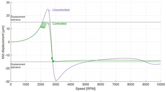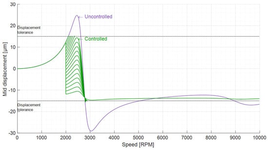 Adaptive algorithm action on the rotor mid-point radial displacement, with a 15 radial displacement tolerance and 2000 RPM as the adjusting speed.