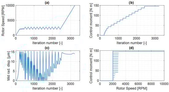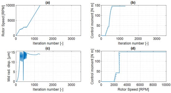 Figure 13 gives further insights on the algorithm path used to overcome the resonance peaks without exceeding the displacement tolerance, where various parameters can be seen against the iteration number, which represents one loop in the algorithm shown in Figure 5. Here it seen that a control moment of 43 Nm is enough to overcome the first resonance peak, while it needs to be increased to 145 Nm to overcome the second peak. The entire speed range is covered in about 3200 iterations of the algorithm, which can be related to a time via the inertia of the rotor and the maximum torque of the motor used to spin the rotor.