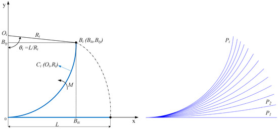 where constants C and D depend on chamber geometry and material. Here, the bending angle varies in a nonlinear way with input pressure and could be a better choice for modeling PneuNets made from hyper-elastic materials since constant C is inversely proportional with the square of E [30]. Considering the constant curvature assumption, if a PneuNets actuator is fixed at one end and the other one can bend freely, the bending moment M generated from the pressure force and inner area of the pneumatic chambers will extend the actuator from the initial position to a final position. For each input pressure Pi will result in a different circular shape Ci(Oi,Ri), with center Oi on the Oy axis and radius Ri, as presented in Figure 2. The coordinates of point Bi(Bix, Biy) at the tip of the actuator can be calculated by using [30,31]: