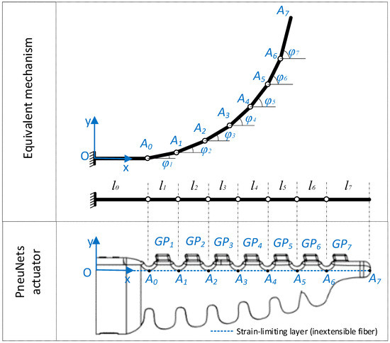 The equivalent mechanism is used to model the shape (deformation) of the actuator (gripper finger). The mechanism consists of a series of kinematic elements connected to each other by revolute joints that mimic the shape of the actuator. Such an approach is a suitable trade-off between the complexity of a real PneuNets actuator (nonlinear flexible structure) and the simplicity of a planar rigid body serial manipulator where the elasticity of the elements is neglected. Therefore, the number of elements of the mechanism equals the number of pneumatic chambers of the actuator. In addition, the accuracy of the model depends on the number of pneumatic chambers.