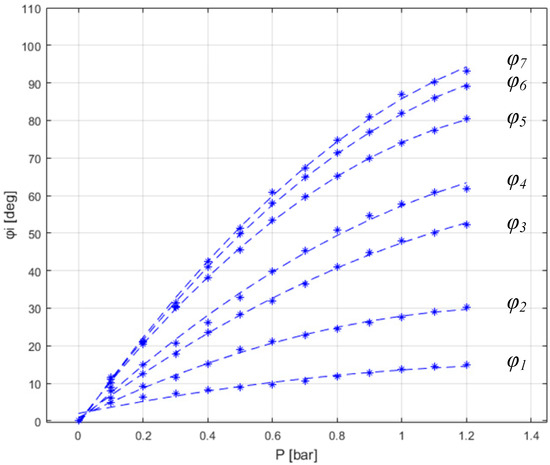 Using the experimental setup presented above, a set of measurements were performed to obtain the absolute values of angles φj {j = 1…7} with respect to the fixed frame based on input pressure. As shown in Figure 6, one end of the flexible bending sensor was attached successively to each gripping pad GPj {j = 1…7} of the actuator chambers PCj {j = 1…7} and the other one to the fixed element.