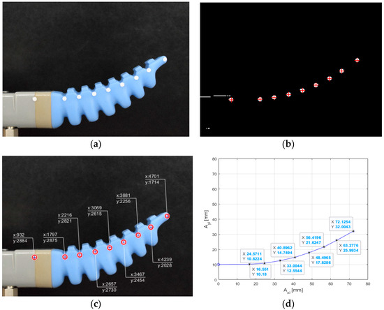 Image processing steps for P = 0.3 bar: (a) original image with markers (b) identification of marker positions (c) markers’ cartesian coordinates (in pixels) (d) coordinates of Ai points in relation with the actuator reference system.