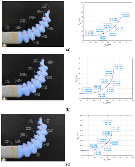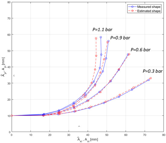 In Figure 11 are presented the measured and estimated shapes of the actuator. The obtained errors depend on the successful implementation of each step of the proposed method, being related to the following: the accuracy of the sensory measurement system of angles and input pressures, the algorithms used for approximation functions, markers’ positioning, image processing techniques, camera resolution, camera lens distortion.