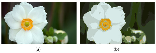 In this first step, the image to be reproduced was selected and saved in a proper format: a matrix with dimensions . In this work, RGB images were considered, as the one of Figure 1a. The number of colors of the image was reduced according to the user-defined parameter , since the number of colors that the robot can manage was limited. Furthermore, the mixing of multiple colors to obtain particular shades has not yet been implemented. The resulting image was an RGB image, with pixel values in the range , as in Figure 1b.