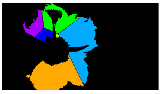 The area division was performed by superimposing the Voronoi cells lines on the original image. In this way, the original image area was divided into smaller subareas. Formally, V is the image matrix that represents the lines that define the Voronoi cells ( at the pixel belonging to the lines; elsewhere). L is the image matrix to be divided ( at pixels of the area to paint; elsewhere). The final image F is defined by the logical operator: . An example of Voronoi area division is shown in Figure 2, where, for the sake of clarity, each separated area is represented with a different color.