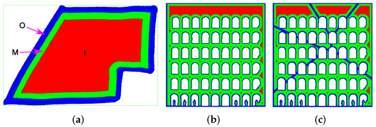 Example of image erosion. (a) Example of the eroded contour of a region and the definition of the obtained areas. (b) Eroded image obtained without dividing the area. (c) Eroded image obtained by dividing the area.