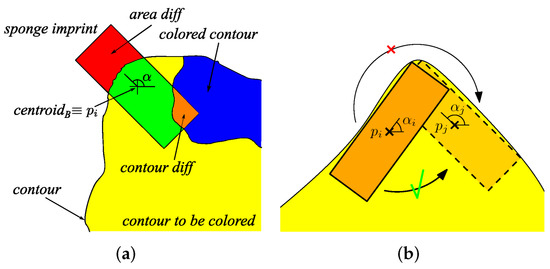 - Dragging technique: The sponge is moved between positions on the canvas without being raised. This technique is more complex to simulate. Considering two defined points, and , if , with a user-defined maximum distance, a series of n intermediate points that connect and are created. In these intermediate points , the sponge imprint has to be verified; if it falls outside the area to paint, the sponge is raised. Furthermore, during the movement through the intermediate points , the sponge is smoothly rotated between the rotation configuration of and (the sequence of consecutive poses is interpolated). If the starting angular position is and the ending one is , the intermediate points’ angular positions are . It was also evaluated if the rotation was convenient to be clockwise or counterclockwise, with the goal of maximizing the coloring contribution to the area yet to be painted (Figure 4b). This process substantially corresponds to the addition of several poses to the original ones.