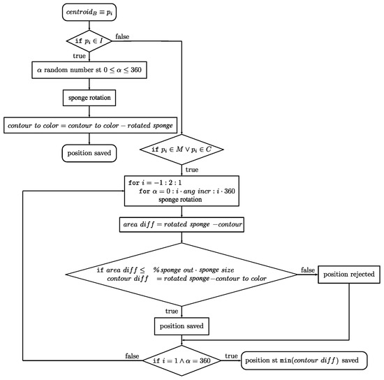 To find the best angular rotation of the sponge (or the brush) in every defined point, the algorithm flowchart shown in Figure 5 is provided. The variables and parameters used in the flowchart are illustrated in Figure 4a. Their definitions are the following: