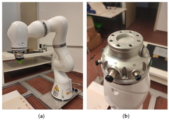 The painting system was built on a KUKA LBR iiwa 14 R820 robotic platform, shown in Figure 7a. This 7-axis robot arm offers a payload of 14 kg and a reach of 820 mm. The repeatability of the KUKA LBR iiwa 14 R820 robot is ±0.1 mm [39]. The manipulator was equipped with a Media flange Touch electrical, a universal interface that enables the user to connect electrical components to the robot flange (Figure 7b). The flange position is described by its tool center point, which is user defined and can be personalized depending on the tool attached to the robot flange.