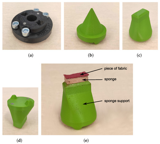 In order to equip the robot for sponge painting, three components were designed (Figure 8): a connector, a calibration tip, and a sponge support. These components were fabricated using an Ultimaker 2+ Extended 3D printer. The connector was fixed to the robot flange with four screws. The calibration tip and the sponge support can be easily interfaced with the connector thanks to a pair of magnets with a 4 mm diameter, which were inserted into the printed material. The sponge used for painting was a make-up sponge (20 × 4 cm) with a piece of fabric glued on its top (Figure 8e). The size of the sponge was chosen empirically. However, the algorithm works with any size and section of sponge, but the larger the sponge, the less details can be painted and the less time it takes for the robot to paint. The piece of fabric on the tool was used to improve the dosage of water: the sponge works as an absorber, and the piece of fabric reduces the quantity of water that is deposited on the canvas. The main problems are related to the great variability given by the sponge behavior, by the color that can be less or more diluted, but also by the canvas paper that, after some time, becomes soaked by the water contained in the pigment solution.