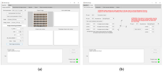 The KUKA LBR iiwa was programmed in the Java environment, and the Sunrise Workbench application by KUKA was used to develop the applications needed to control the robot and set the software parameters. The image-processing and contour-filling algorithms (described in Section 2) were developed in MATLAB. To facilitate the software interface, a user-friendly MATLAB app was developed, which allows the user to set the parameters for the non-photorealistic rendering techniques, as well as to calibrate the painting setup and send commands to the manipulator (Figure 9).