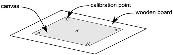 The robotic sponge painting required a calibration of the painting surface, as well as a calibration of the height of the sponge during color discharge. The canvas surface was calibrated using a procedure similar to the one implemented in [9,22]. More in detail, the robot equipped with the calibration tip was manually moved in contact with the canvas surface in five calibration points, as shown in Figure 10. The z position of the robot tool on each of these points was acquired using the MATLAB app. Actually, only three points could be sufficient, but a higher number was considered to improve accuracy. The interpolating plane was then generated starting from the five calibration coordinates and used to define the corresponding z coordinate for each planar position generated by the image-processing algorithm.