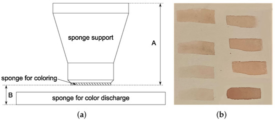 A calibration of the sponge height during color discharge was also needed to adjust the sponge compression during painting and, therefore, the quantity of color released. This operation was performed with a trial-and-error approach, since in this work, force control was not implemented on the robot. Figure 11 shows a scheme of the sponge discharge and some examples of sponge imprints for different heights. As can be seen from the figure, a compromise between a complete sponge imprint and a good amount of released water was needed. Indeed, if too much water were released on the canvas, the wet paper would produce ripples and undulations that would affect the quality of the results.