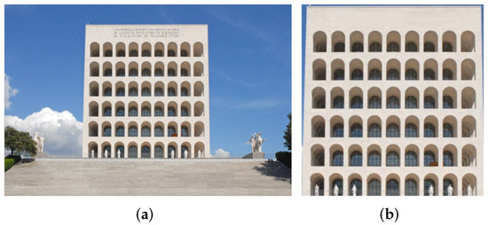 Palazzo della Civiltà Italiana in Eur District in Rome, Italy. Source: [40]. (a) Original image. (b) Image used in the proposed algorithm: the original one was cropped, and the top inscription was removed.