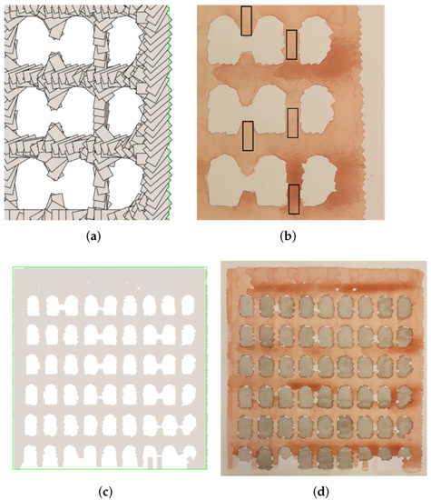 Processing of the “Palazzo della Civiltà Italiana”: in (a) the planned poses of the sponge on the canvas; in (b), a detailed view of some poses on the real painting; in (c), the simulated painting; in (d), the experimental result (dimensions: 35 × 35 cm.)