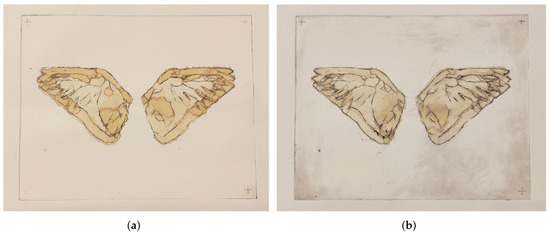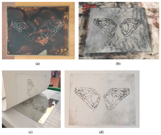Phases of the etching for “Wings”. (a) Result obtained after the incision of the wax. (b) Ink cover of the metal plate. (c) Pressing of the metal plate onto a canvas. (d) Result of the etching technique (dimensions: 24 × 30 cm).