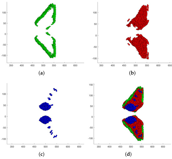 The simulations of the coloring of the three different threshold images are reported in Figure 17. From the figure, it is possible to note that the threshold images overlapped due to the filtering applied during the algorithm execution.
