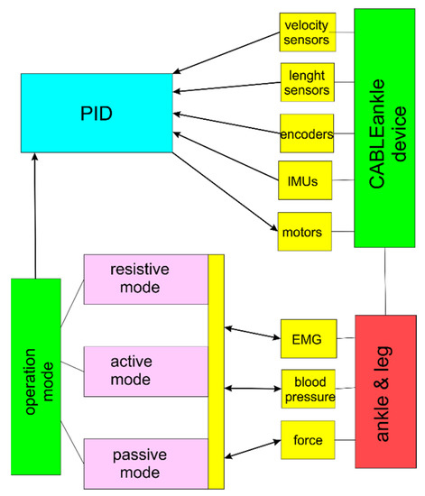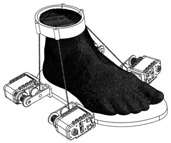 Previous work regarding CABLEankle [29] describes the working of the model along with the necessary kinematics, static, and force closure analysis to evaluate the performance based on parameter such as maximum cable tension, load on the ankle joint, and range of motion. However, whereas previous work discusses the CABLEankle’s mechanical design, a control system design is needed to integrate the sensors and motors with proper motion capabilities, which are required to perform a desired motion assistance by exerting forces and tensions according to the requirements of different stages of rehabilitation. This is usually achieved by developing three different operational modes, namely active training, passive training, and assistive training. Preliminary work on such control schemes has been presented in [30,31], but it is only applied to designs with a static platform, rather than wearable ones.
