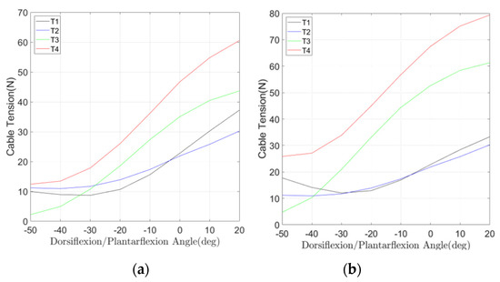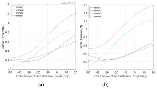 The results in Figure 7 and Figure 8 show for the motion of dorsiflexion/plantarflexion that the maximum cable tension values are less than 90 N for both passive and active resistive rehabilitation cases. Thus, with an appropriate pulley design, the device can operate without reaching the servo motor’s upper limit for the ankle’s whole range of motion as planned in a full exercise [27].