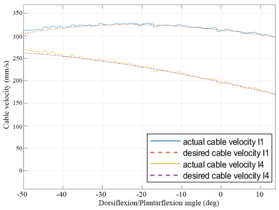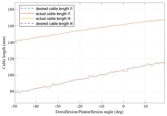 In particular, plots representing the desired and actual cable length and velocity values are shown in Figure 9 and Figure 10. It can be noted that, with the proposed controller, the system is able to achieve a stable behaviour, which closely follows the desired one, with a maximum error of 2 mm throughout the full range of motion over dorsiflexion/plantarflexion exercises.