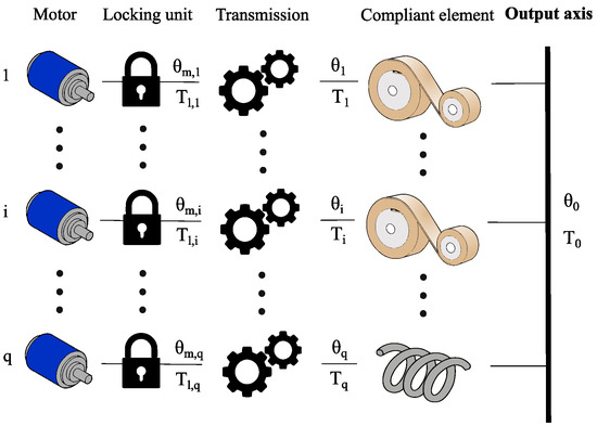 - Parallel Elastic Actuators (PEA) [8,26,27,28,29,30]: actuators with a compliant element placed in parallel with the motor which modifies the torque profile of the motor and hence reduces mainly the Joule and gearing losses.
