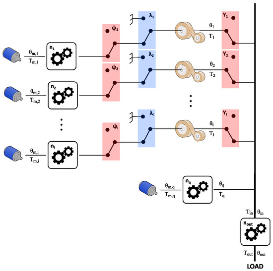 In this topology, all branches contain constant torque springs, which are the so-called discrete torque units. Since continuous torque is necessary, the last unit uses a linear spring. The topology shown in Figure 1, however, still contains some non-ideal parts, although a large increase in efficiency was simulated compared to an equivalent SPEA [39]. One of the main downsides is that a direct path between the motors and the output is present, leading to power consumption even when the load is driven from the output side. This can also lead to inefficient back-driving behavior. The problem stems from the initial design of the +SPEA, as can be seen in Figure 2b. It has already been partially solved by the intermittent design of the iSPEA (depicted in Figure 2a), where only one motor is in contact with the load, and by using holding brakes in the +SPEA, the motors are prevented from being loaded. For the iSPEA, this occurs, however, at the cost of speed, since it has to go through a cycle. For the +SPEA, it is at the cost of brakes that also consume energy. A perfect solution would thus consist of the motor decoupling behavior of the iSPEA and the multiple recruitment possibility of the +SPEA, while avoiding the use of brakes when the motor is in stasis.