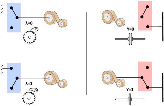 Visualization of the different states of the used locking mechanisms. The blue boxes always represent a ratchet and pawl mechanism and the red boxes always represent an electromagnetic clutch. Here, the visualization of the variable is not shown explicitly, but it is the same as for .