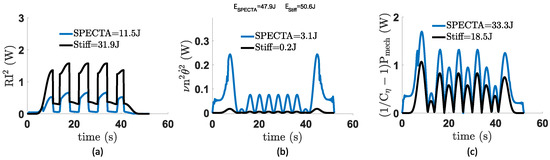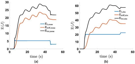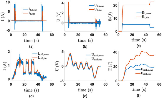 When looking at the current and voltage values of (d)–(e), it is clear that the curves fit well, although the experimental values are always slightly lower, which is most likely caused by poor prediction of the exact torque value of the constant torque spring. This, in turn, results in a lower measured energy consumption of the stiff motor unit (f) than expected from the simulations ( J vs. 35 J). As energy recuperation already happens for motor 1 during the test (and not during simulation), the stiff motor recuperates less energy at the end of the trajectory in comparison with its simulated counterpart.