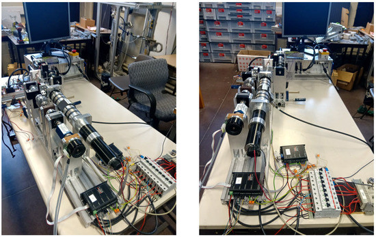 The test setup consists not only of the mechanical part, but also of the control part. Briefly, it can be said that each of the 4 motors is driven by an ESCON servo controller as this is the only Maxon motor controller that can work with analog signals (which is necessary when working with Speedgoat). The exact used controllers are the Maxon ESCON 50/5 (part number 409510) for the stiff, continuous torque motor, and the Maxon ESCON 70/10 (part number 422969) for all the other motors. All these motors are position-controlled, except for the load motor which is torque-controlled, with the use of the output torque sensor. For the driver of the stiff motor, current control is used as a control method, whereas the other drivers are velocity-controlled. The control mode of the stiff motor and the load motor must be different, otherwise, they will only work against each other when a small measurement error occurs.