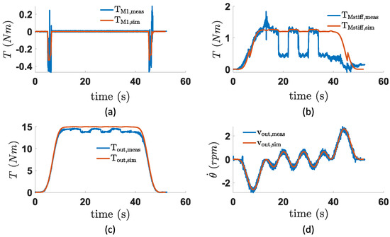 Overview of the motor torques (after the gearbox) of (a) the first (high-torque motor) unit and (b) the last (continuous torque) unit, together with (c) the torque and (d) velocity values at the output. For each plot, both the simulated (orange) and measured (blue) data are included. These data were retrieved when performing/simulating a pendulum task for a task angle and a variation of .